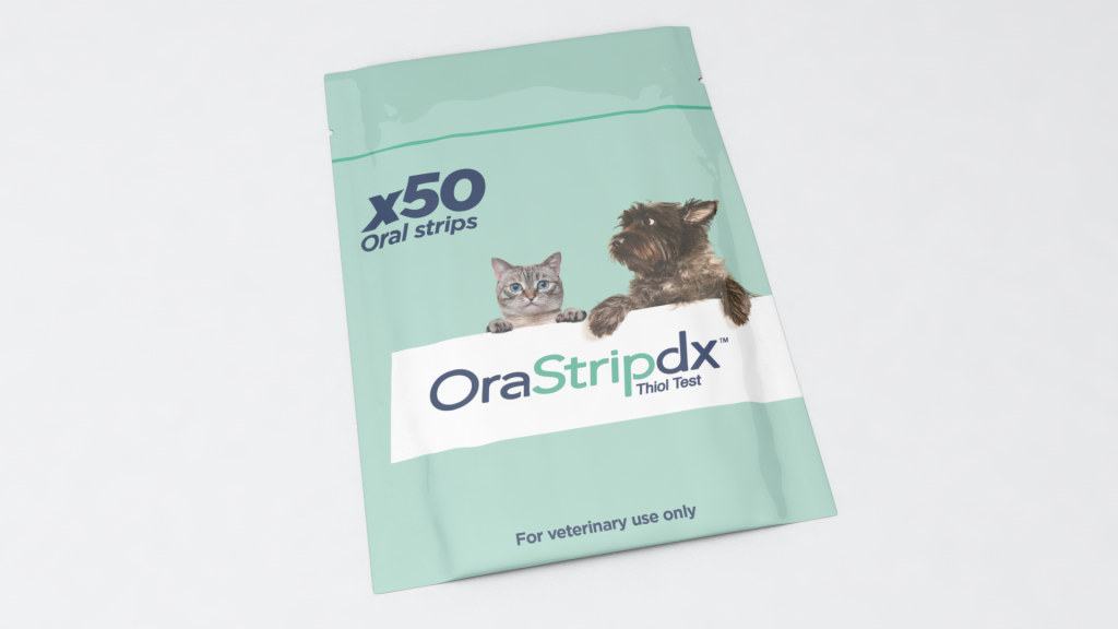 Each OraStripdx™ comprises a dry porous pad, pre-treated with a mixture containing a thiol detection reagent, attached to a plastic backing. The easy-to-use strip is gently swiped along the maxillary gingival margins. The pad changes colour from off-white to various intensities of yellow, representing the concentration of thiols present. The result gives the veterinary team a snapshot of the pet’s dental health, indicating the probability of significant periodontal disease and alveolar bone loss.
