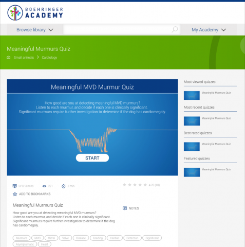 This fun and interactive online quiz is the latest cardiology offering from Boehringer’s pioneering Boehringer Academy, an online educational resource that enables veterinary professionals to keep up-to-date on the latest advances in veterinary medicine.