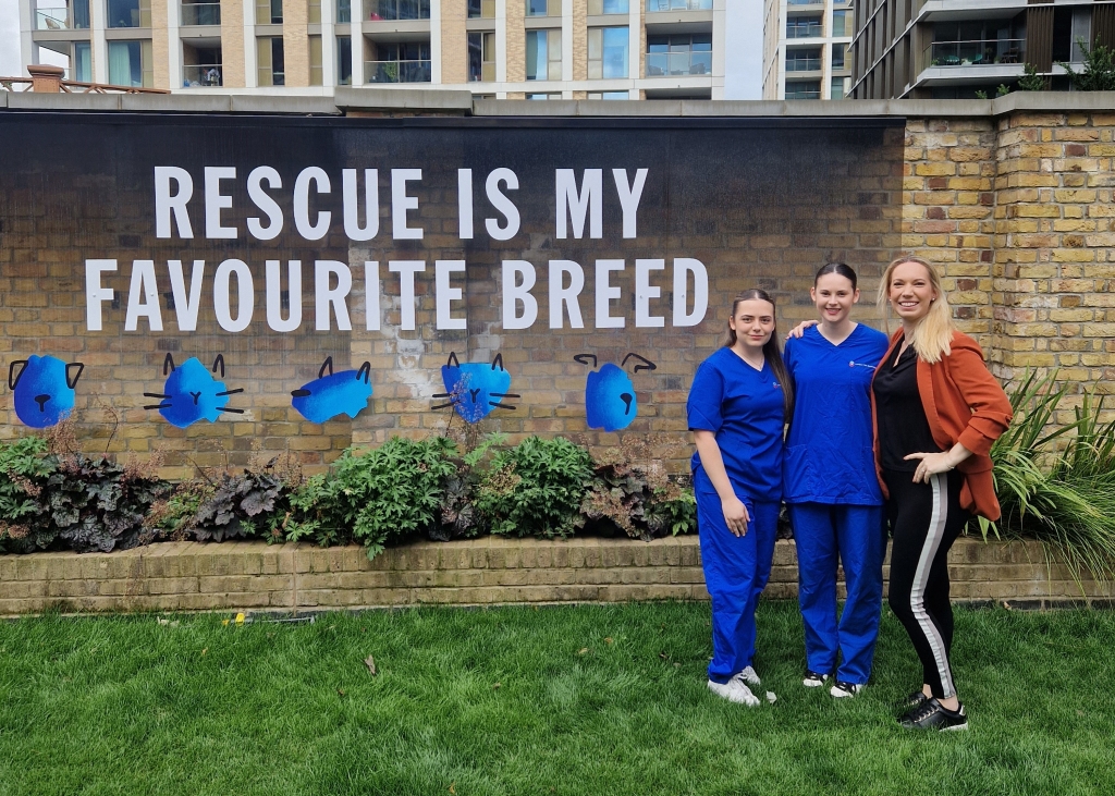 London Vet Specialists hospital director Emma Laws and fellow LVS volunteers, vet nurse Scarlett Dean and patient care assistant Holly Hassan, at the famous Battersea Dogs and Cats Home.