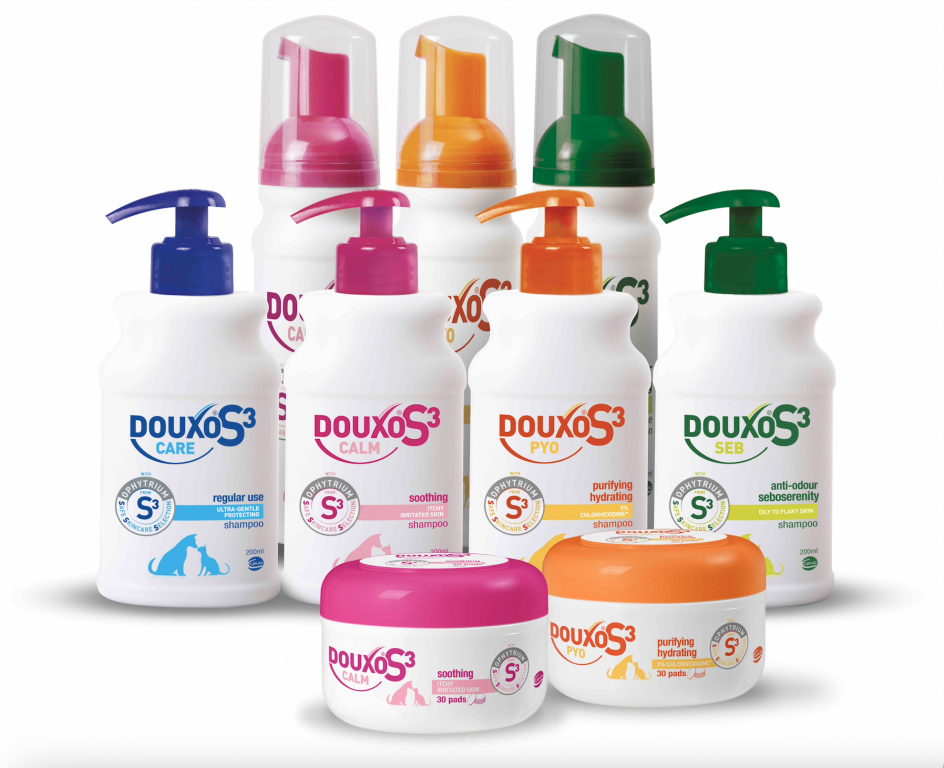 The full DOUXO S3 range includes: DOUXO S3 CALM, SEB, PYO and CARE and consists of shampoo, mousse and pad formulations. DOUXO S3 PYO contains ophytrium and chlorhexidine at 3% which is both antibacterial and antifungal (tough on bugs, gentle on skin). DOUXO S3 SEB features ophytrium and seboliance, a natural extract from the peel of Punica granatum (pomegranate). It has an anti-odour action and will help with oily or flaky skin. Lastly, DOUXO S3 CARE contains ophytrium and is ultra-gentle for regular use and maintenance (this is available as a shampoo only).