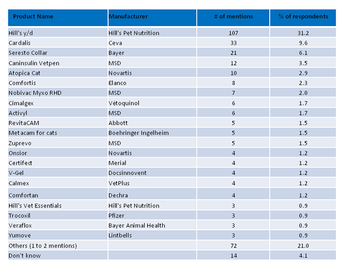 Between 23rd November and 23rd January, vets were asked to think of new products, pharmaceuticals, foods or services they used in their clinics and, unprompted by us, write just one down.