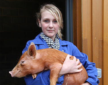 Hollie Orchards learns how to handle one of the Tamworth pigs