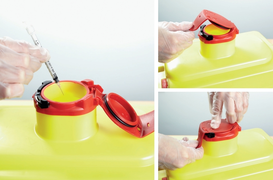 Three sizes of sharps bins have been introduced, at 7.5L, 15.1L and 30.1L. They are made from recyclable plastic, and similair in shape and form to original sharps bins but with a temporary locking top which snaps shut when full.