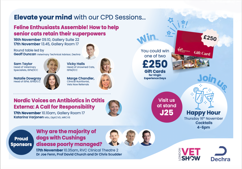 Dechra is hosting an exclusive series of companion animal CPD sessions at the London Vet Show (LVS) on Thursday 16 and Friday 17 November featuring leading veterinary specialists.