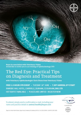 Veterinary Vision are hosting a free CPD event in association with Bayer at the Ramside Hall Hotel in County Durham on Tuesday 14th June. The evening starts at 7.30pm with a hot buffet and the CPD will begin at 8pm. Referral veterinary ophthalmologist and director of Veterinary Vision Chris Dixon will be discussing ‘The Red Eye’ and offering tips and advice which can be used in practice with a particular focus on diagnosis and treatment.