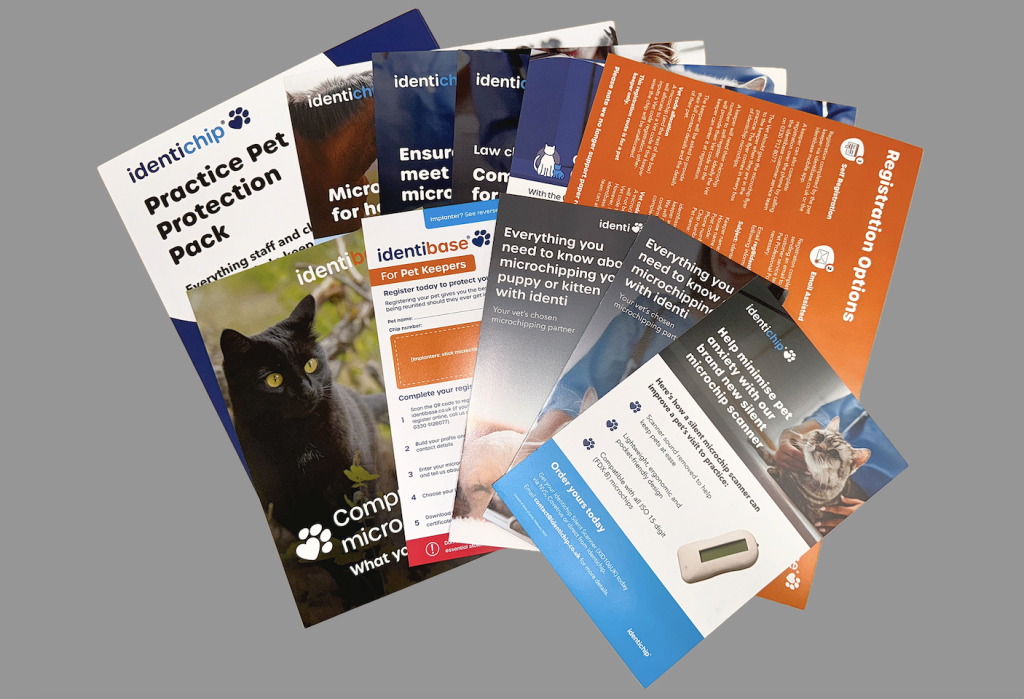 The comprehensive reference guide consists of a range of support material covering everything staff and clients need to know to help keep pets safe. The pack features species-specific microchipping law guides, practice registration guide, cat chipping cheat sheet and flyers on registration and identi’s silent microchipping scanner. It also includes examples of leaflets that can be ordered for vet practices to hand out to clients including flyers on ‘Everything you need to know about microchipping with identi’ for both adult pets and puppies and kittens and a leaflet on compulsory cat microchipping.