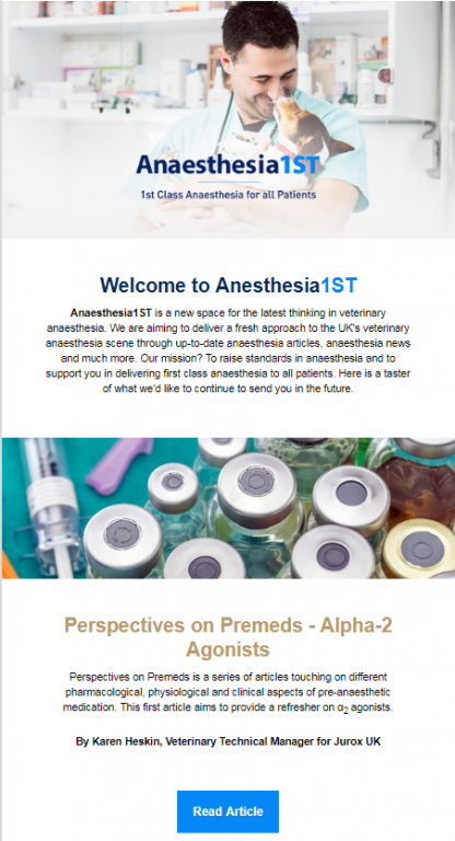 To sign up to the Anaesthesia1ST newsletter click here, visit the Alfaxan website – www.alfaxan.co.uk, contact your local Jurox technical sales representative or email Jurox at [email protected].