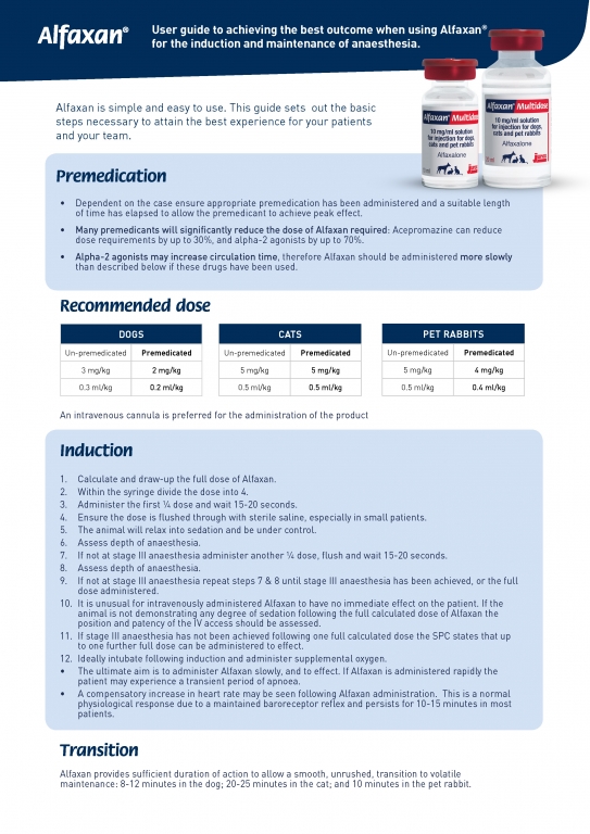 The support pack features information on the role anaesthetic induction agents can play in the maintenance of anaesthesia to help vets provide appropriate care for their patients. It includes: a user guide to achieving the best outcome when using Alfaxan for the induction and maintenance of anaesthesia; a summary of peer reviewed key clinical papers on the use of Alfaxan and how it can be used for the maintenance of anaesthesia; a comprehensive article discussing the use of intravenous agents to maintain anaesthesia in the dog and cat; frequently asked questions and an Alfaxan dosage chart for CRI (Constant Rate Infusion) and intermittent bolus. To access your downloadable support pack, please visit www.alfaxan.co.uk.