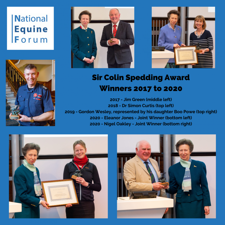 Previous winners of the Sir Colin Spedding Award include tireless Suffolk Punch champion Nigel Oakley (2020 joint winner); welfare-driven equestrian journalist Eleanor Jones (2020 joint winner); equine sector stalwart Gordon Wesley (2019); exceptional farrier Dr Simon Curtis (2018); fire and rescue pioneer Jim Green (2017); riding school and equestrian education champion Sue Martin, of Trent Park Equestrian Centre in London, (2016); Thoroughbred racing and breeding advocate Paul Greeves, formerly of Weatherbys, (2015); equine infectious disease expert Dr Andrew Waller on behalf of The Animal Health Trust (AHT) Infectious Disease Group (2014); and actor Martin Clunes in recognition of the collective work of the UK Equine Welfare charities during the winter of 2012 (2013).