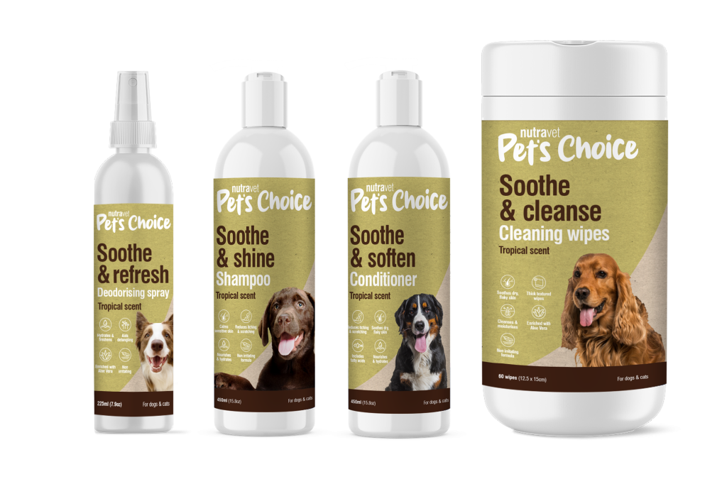 Nutravet Pet’s Choice includes, Soothe & Shine Shampoo, Soothe & Clean Wipes, Soothe & Fresh Deodorising Spray, and Soothe & Soften Conditioner.