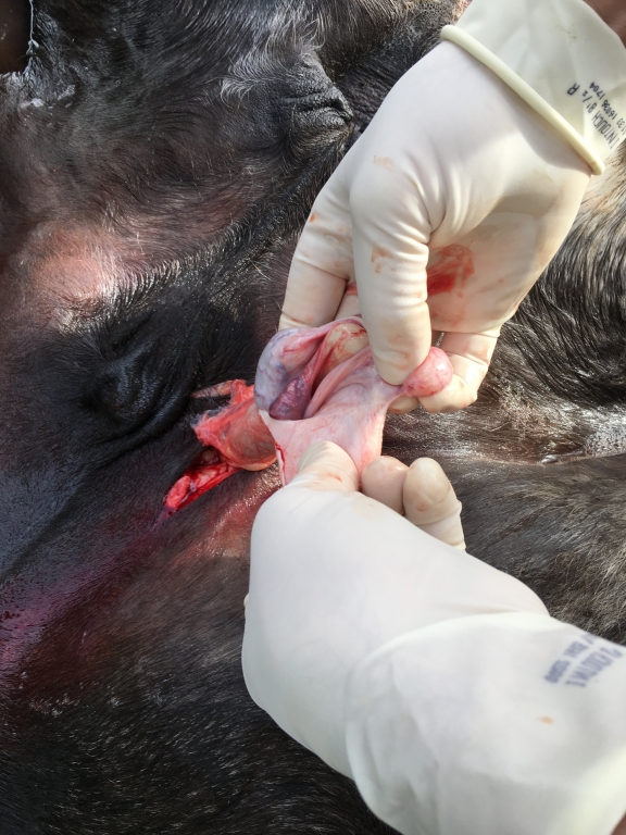 A 5-year-old stallion undergoing open castration under general anaesthesia for removal of an inguinally retained right testicle in the field.