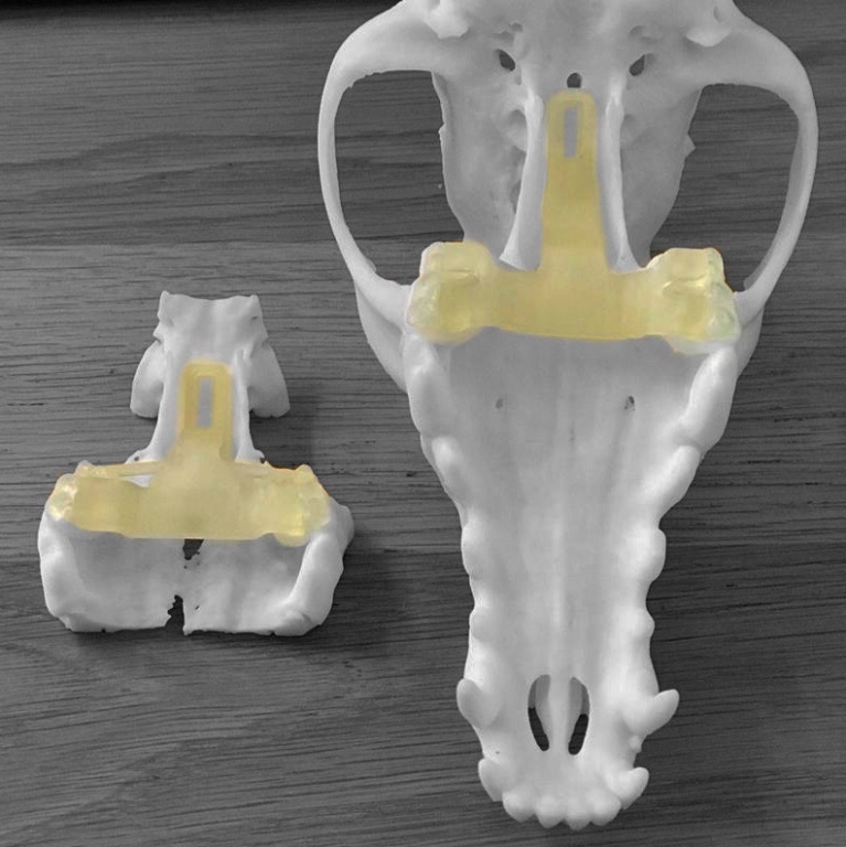 This study explored whether a 3D printed surgical guide, placed in the dog’s mouth, could aid specialist neurosurgeons in locating the correct site of the pituitary with good accuracy. The team found that it was possible to create a 3D printed guide from CT images, and that it can be used by surgeons to accurately identify the exact location of the body cavity containing the pituitary gland. The final design, developed with collaborators at Vet3D[i], Dr Bill Oxley, is a guide that locks on the dog’s molar teeth and is bespoke to each patient, based on their CT images. It will enable veterinary neurosurgeons to offer the best clinical care every time.