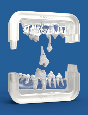 An accurate representation of the animal’s mouth, the teeth are pre-sectioned, indicating how tooth crowns should be divided and where to cut the crown to achieve single root pieces..