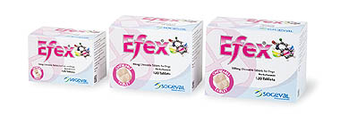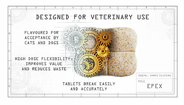 Efex tablets are available in convenient to prescribe, three blister pack sizes of 10mg, 40mg and 100mg that break easily and accurately into halves for cats and halves and quarters for dogs facilitating accurate dosing for a wide range of patients. In cats, the flavoured chewable 10 mg tablets allow accurate dosing of 2.5kg and 5kg cats at 2mg/kg once daily. In dogs the 40mg four way break tablet is designed for a 20 kg dog and the 100mg for a 50kg dog.