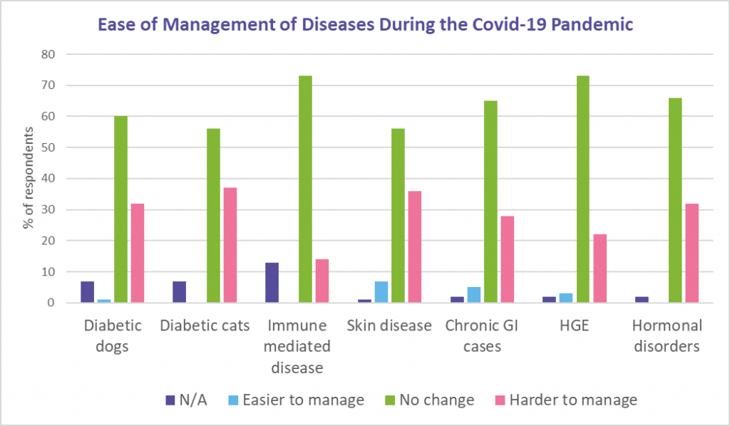 When asked which conditions had been harder to manage clinically since the start of the pandemic, chronic medical conditions topped the list. Diabetes in cats was reported to be harder to manage by 37% of vets, slightly more than diabetes in dogs (32%). Other conditions which presented increased challenges to management included hormonal disorders, such as hyper- and hypo-adrenocorticism (32%) and chronic gastroenteritis (28%). While a significant number found skin disease harder to manage (36%), a small number reported it to be easier to manage (7%).