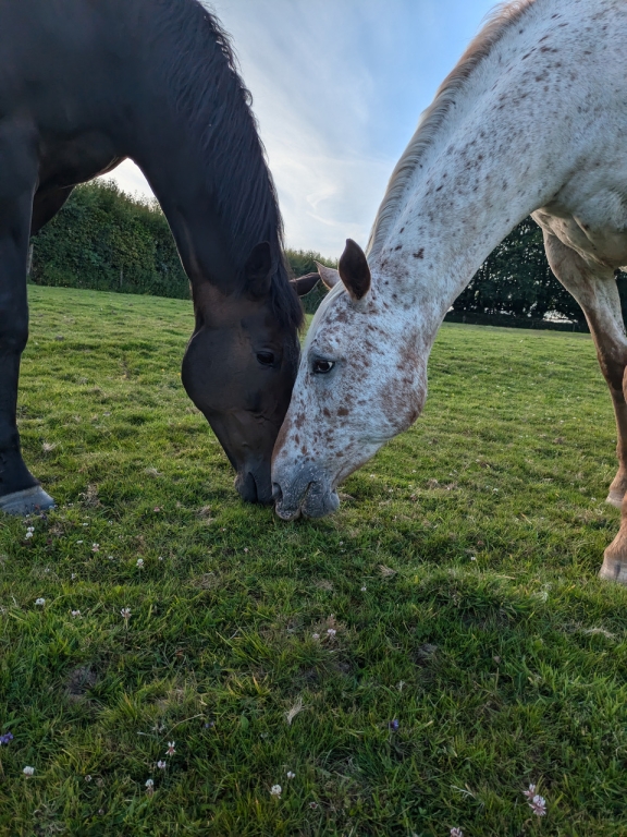 Robbie, the bay gelding in the picture, is owned by Ellie, while Tilly, the appaloosa mare is owned by one of Ellie’s best friends. Robbie was previously a racehorse and Tilly was a leisure riding horse before they were retired. They lived together for a couple of years in Devon and formed a strong friendship, as can be seen from the photograph.