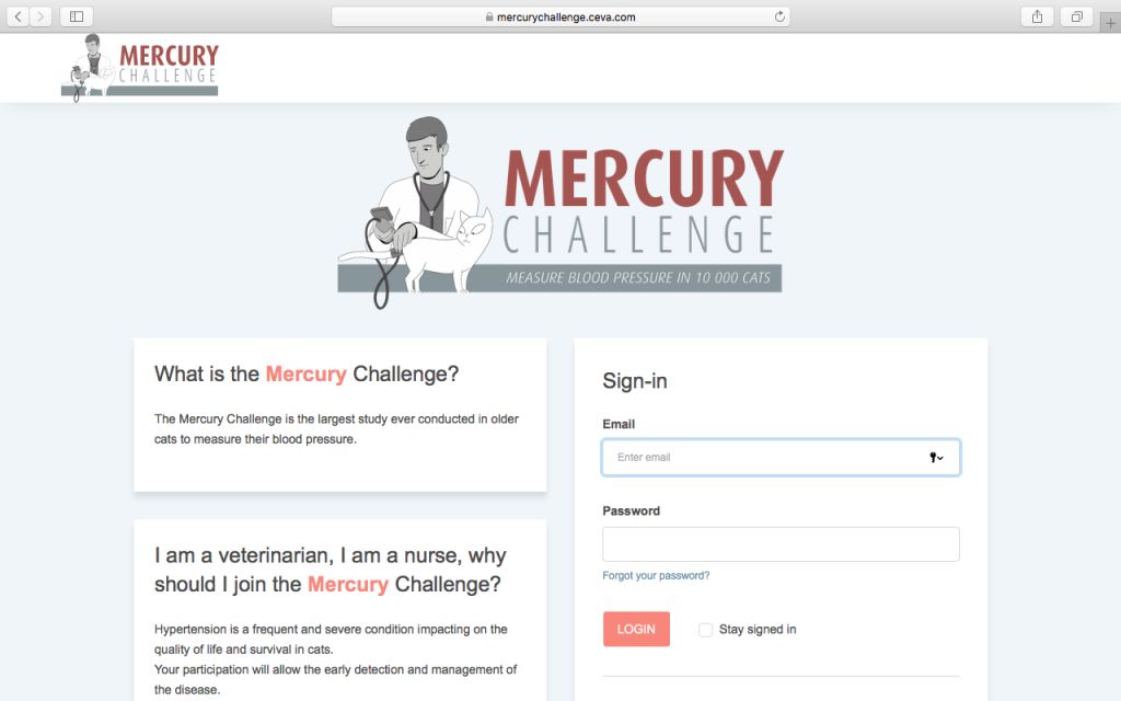 Vets participating in the initiative need to input five mandatory pieces of information into the Mercury Challenge website - mercurychallenge.ceva.com - the owner’s name, cat’s name, age, systolic blood pressure and time spent measuring blood pressure. Additional information includes: weight, breed, sex and whether the animal has any concurrent diseases, such as chronic kidney disease or hyperthyroidism, or is on any treatments.