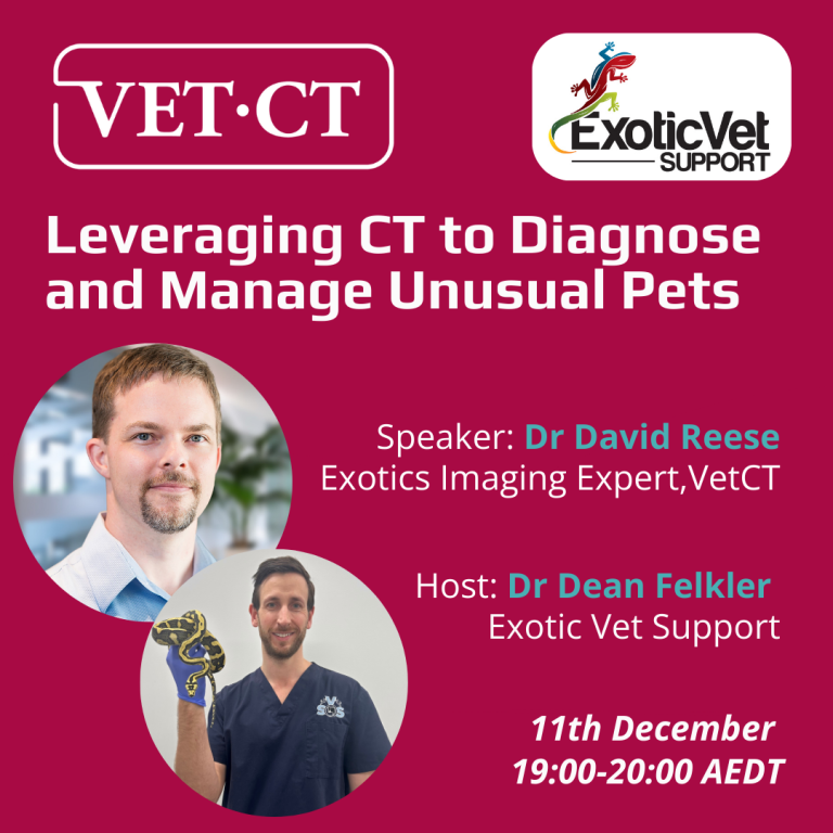 Dr David Reese, Director of VetCT Australia, Diplomate in veterinary diagnostic imaging and exotics imaging expert, will be speaking on; "Leveraging CT to Diagnose and Manage Unusual Pets", followed by a live QnA. The webinar will be hosted on 11th December, 08:00-09:00 by Dr Dean Felkler from Exotics Vet Support. Veterinary professionals around the globe are invited to register for the webinar via this link.