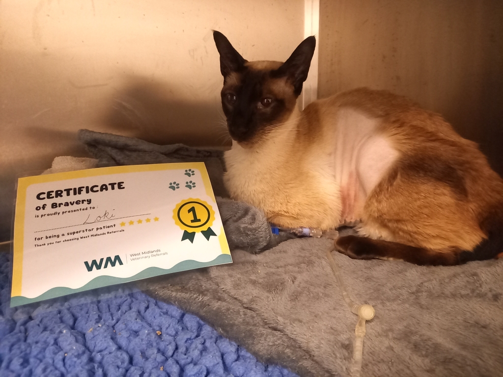 Siamese cat Loki is feeling much better thanks to lifesaving treatment by West Midlands Veterinary Referrals in Burton on Trent.